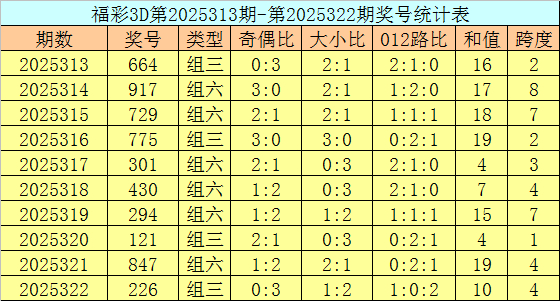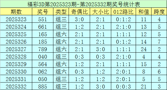 上期回顾:福彩3D第2025332期开奖号码为885,组选类型为组三,奇偶比为1:2,大小比为3:0。