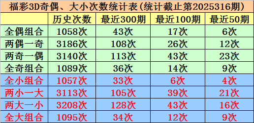 奇偶、大小分析:在最近50期开奖中,两偶一奇组合开出12次,当前遗漏4期、两奇一偶组合开出23次,当前遗漏1期、全奇组合开出9次,当前遗漏0期、全偶组合开出6次,当前遗漏3期,本期注意两偶一奇组合;全小组合出现4期,当前轮空11期、两小一大组合出现21期,当前轮空5期、两大一小组合出现16期,当前轮空1期、全大组合出现9期,当前轮空0期,本期看好开出两大一小组合。