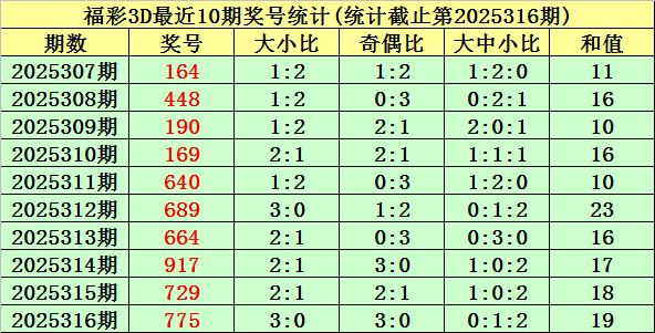 开奖回顾:福彩3D第2025316期奖号为:775。奖号类型为组三,和值为19,奇偶比为3:0,跨度为2,012路比为0:2:1,大小比为3:0。