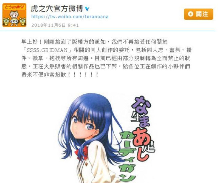 另外还有一个很经典的例子是 《SSSS.GRIDMAN》,版权方并没有起诉作者,而是要求 虎之穴、Melonbooks 将相关同人志全部下架,只允许在同人展现场小规模贩卖。