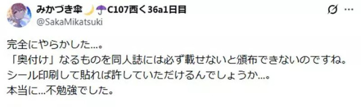 而就在这个节骨眼上,一位昵称为「みかづき伞」的日本绘师,突然在社交平台发出了堪称“同人创作者噩梦”的一条动态——他发现,自己已经印好的同人志,忘记印「版权页(奥付)」了。