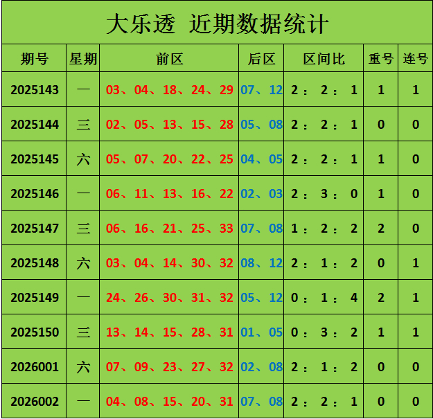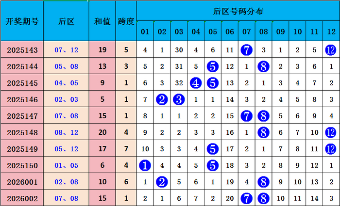 上期后区开出号码07 08,和值10,近十期和值19 13 9 5 15 20 17 6 10 15,和值波动范围较大,本期预测和值会上升,重点关注号码:05 12,和值17。